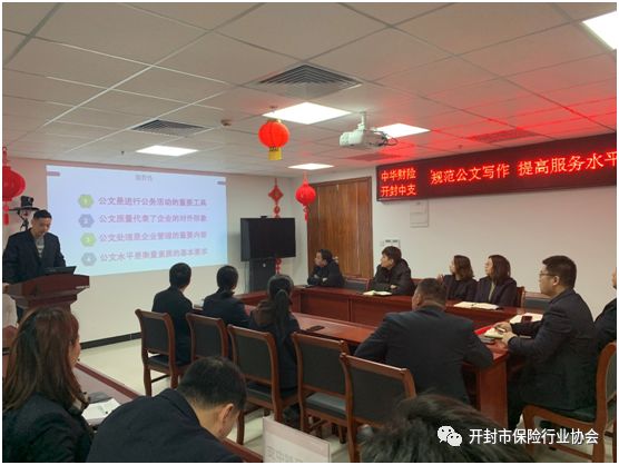 为进一步提升员工公文写作水平,增强公文处理能力和品牌宣传能力,提高信息报送质量和效率,2020年1月6日上午,中华财险开封中支开展公文写作培训活动,机关全体人员参加了培训。