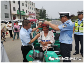 在“庄头镇交通安全疏导站”成立现场,尉氏县交警大队警官和太平洋财险尉氏支公司的工作人员共同举行了“安全守护行动启动仪式”。出席仪式的乡镇、交警、太平洋财险的各位领导向驾驶非机动车的行人赠送了安全头盔,并向群众们讲解安全头盔佩戴方法,现场落实了“一盔一带”行动。太平洋财险尉氏支公司工作人员向过往的群众分发交通规范和基本商业保险宣传彩页,给群众们详细讲解保险政策和知识,将保险理念和安全意识传递到农民中,为将来更好的服务“三农”打下基础。