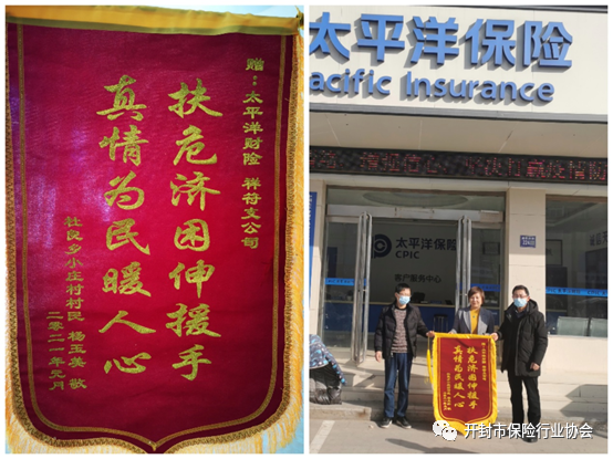 2021年2月1日,开封市祥符区杜良乡小庄村已脱贫农户杨玉美与村第一书记海书记专程来到太平洋财险祥符支公司,亲手赠上“扶危济困伸援手真情为民暖人心”的锦旗。2020年,太平洋财险祥符支公司与祥符区合作推行“防贫保”业务,以政保联办、群体参与、基金管理、阳光操作的创新脱贫新形式,助力我市脱贫攻坚。10月初,杜良乡扶贫办防贫联络站工作人员向我司防贫保工作人员报案,该乡小庄村脱贫户杨玉美与2020年患有帕金森症,现已花费14万余元,对于刚脱贫家庭来说,根本承受不起这样的巨额费用。特向我司询问,是否符合防贫保理赔条件。我司工作人员接到报案后,第二天前往小庄村对其报案农户进行了调查。经调查了解到,杨玉美于2020年5月份不幸在家摔倒,随后在医院确诊患有帕金森症,需安装脑起搏器,总医疗费用17万余元。因病情原因,全部报销后还需要自付14万元。其丈夫在12年确诊结肠癌,家中18年刚脱贫,两个儿子年近30还未结婚。几年来村里为其捐款多次,现家庭负债累累、生活困难。经入户调查,属因病致贫救助对象。但其自费部分占比太高,在向区扶贫办领导汇报后,扶贫办领导确认给予最大帮助,杜绝脱贫再返贫情况发生。终确认理赔金额10万元。村第一书记向太平洋财险表达深深的谢意,对太平洋财险公司的责任担当及“防贫保”险种大加赞赏。