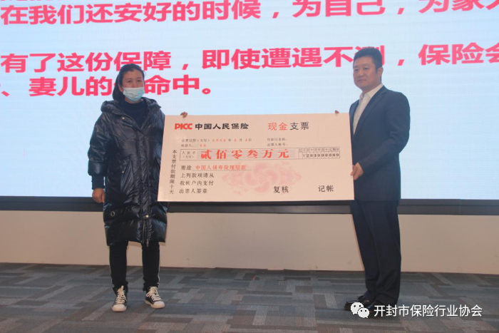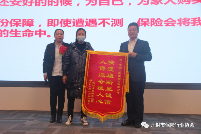 3月3日上午,在人保寿险开封中支“三必超一,再攀高峰”业务动员大会上,客户丁某家属送锦旗的场面,印证了保险的作用,该公司的203万的高额赔付为丁某家庭送去了生活新的希望。