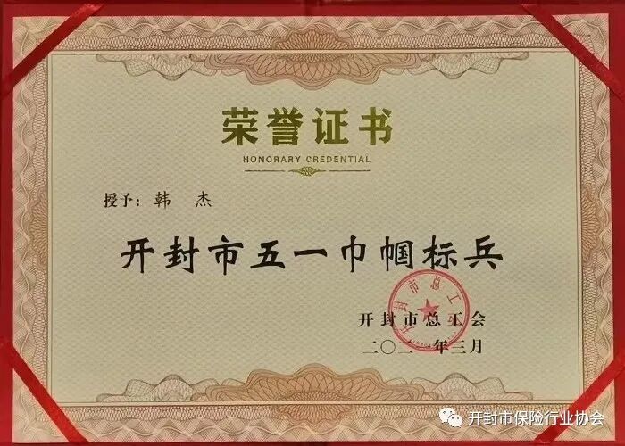 3月18日,从渤海财险开封中支传来消息,该公司总经理韩杰荣获开封市总工会颁发的“开封市五一巾帼标兵”证书。