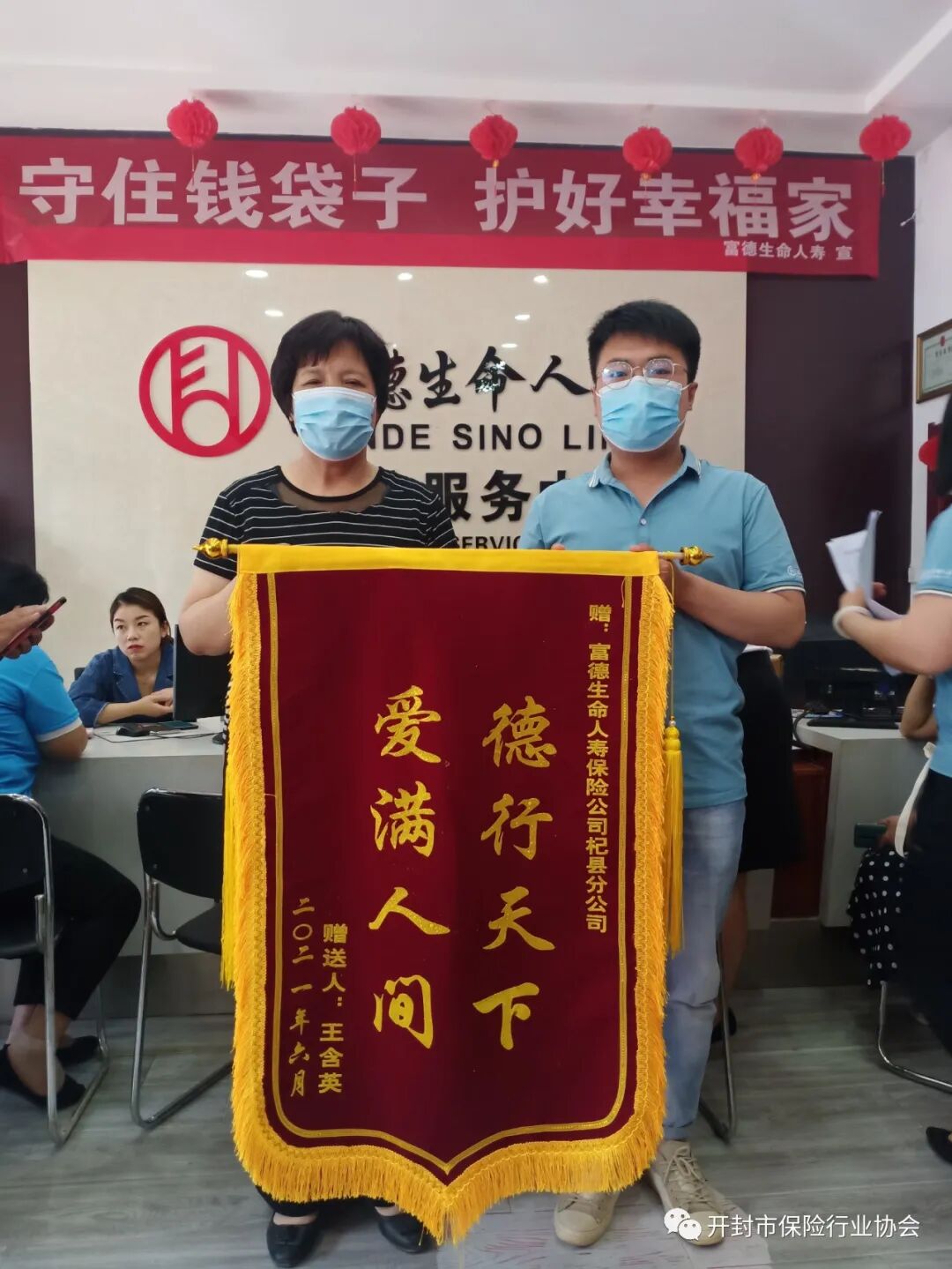 2021年06月02日早上8点客户王女士委托我司业务员谢青竹携带一面锦旗来到了杞县支公司,锦旗上写着“德行天下,爱满人间”。客户王含英2019年03月01日为其女儿周冰投保了《富德生命康健无忧2018版》保额30万,附加《富德生命附加意外门急诊医疗保险》保额5000元,《富德生命附加住院每日补贴医疗保险(A款)》保额20元,《富德生命附加住院费用补偿医疗保险(E款)》保额10000元,《富德生命附加康悦人生费用补偿医疗保险(2019版)》(有社保)保额2000000元。年缴保费5128元。