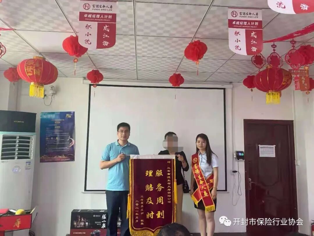 2021年6月14日端午节富德生命人寿兰考支公司举办端午节活动,在这个特殊的日子里,我司客户杜女士及家属应邀前来公司参加端午节活动,并将一面写有“理赔及时,服务周到”的锦旗在现场送到了我司服务人员手中,并且赞扬了公司的服务及理赔,承诺千斤,一言九鼎。