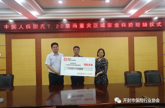 7月28日上午,人保财险开封市分公司“7.20”暴雨灾害农业保险赔付仪式在尉氏县人民政府举行,向902户受灾农户支付赔款1034.31万元。尉氏县政府副县长貊四新,县财政局副局长步寿英、市分公司总经理助理宋利峰、市分公司农险部负责人、尉氏支公司负责人参加赔付仪式。