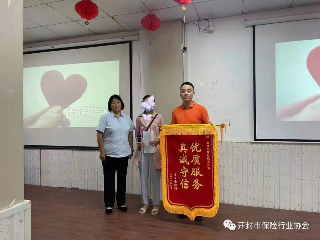 富德生命人寿开封中支尉氏营销服务部近期迎来了一位手拿锦旗的客户,锦旗上写着“真诚守信 优质服务”八个大字。当客户满含热泪把锦旗送到我司工作人员手中时已经激动的说不出话。