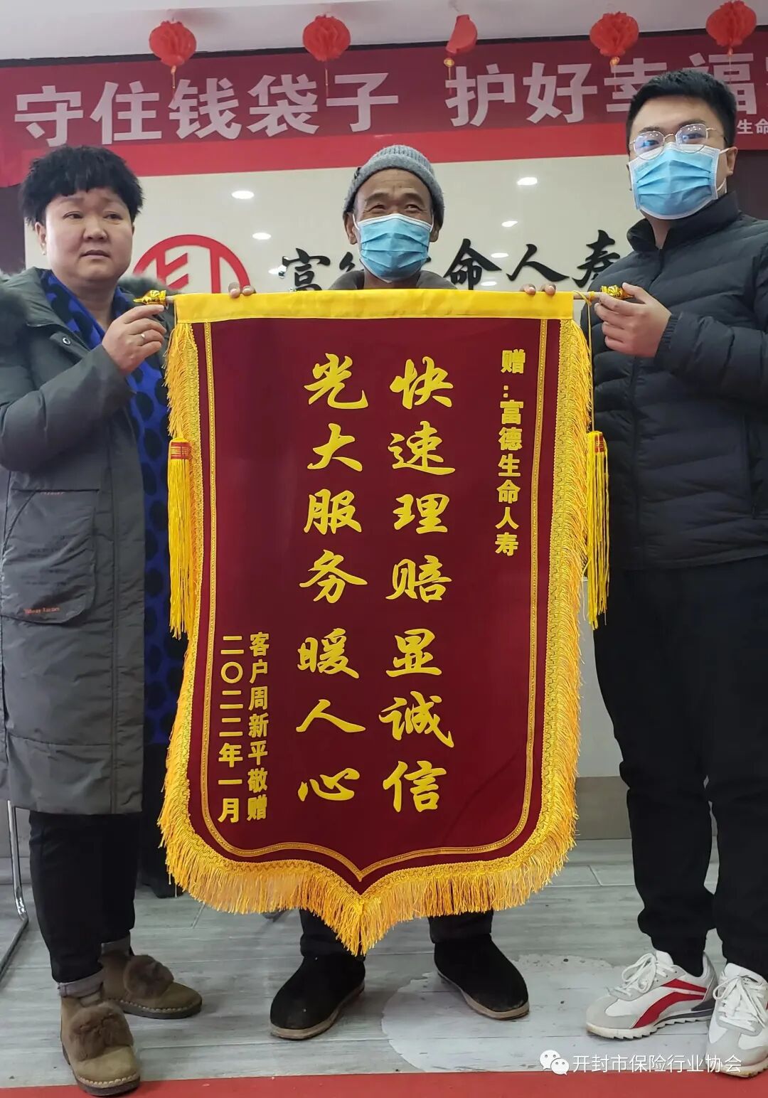 1月11日早上8时,富德生命人寿杞县支公司的柜面迎来了手拿一面写有“快速理赔显诚信光大服务暖人心”锦旗的客户周先生。
