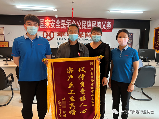 接到理赔款的张先生对华夏保险开封中支和业务员袁红英的服务赞不绝口,将这份感动形成一面印有“诚信负责暖人心,客户至上显真情”的锦旗送至华夏保险开封中支,客户张先生激动的握着业务员和理赔人员的手说道,华夏保险是一家值得托付的公司。