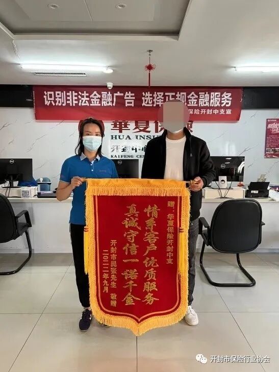 2022年9月底,一面印有“情系客户优质服务 真诚守信一诺千金”的锦旗,从客户家属手中递送到了华夏保险开封中支的工作人员手中。短短16个字,却流露出客户对华夏保险理赔服务的认可和满意。