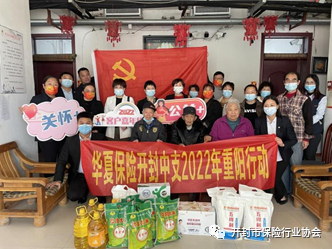 2022年10月,在华夏保险开封中支党支部的号召下,成立慰问小组,在华夏保险开封中支党支部书记李喜玲同志带领下,分别前往开封市区周边两处幸福院,探访孤寡困难老人。在寒冬来临之前,为这些老人送去了温暖的米、面、油等生活物资。