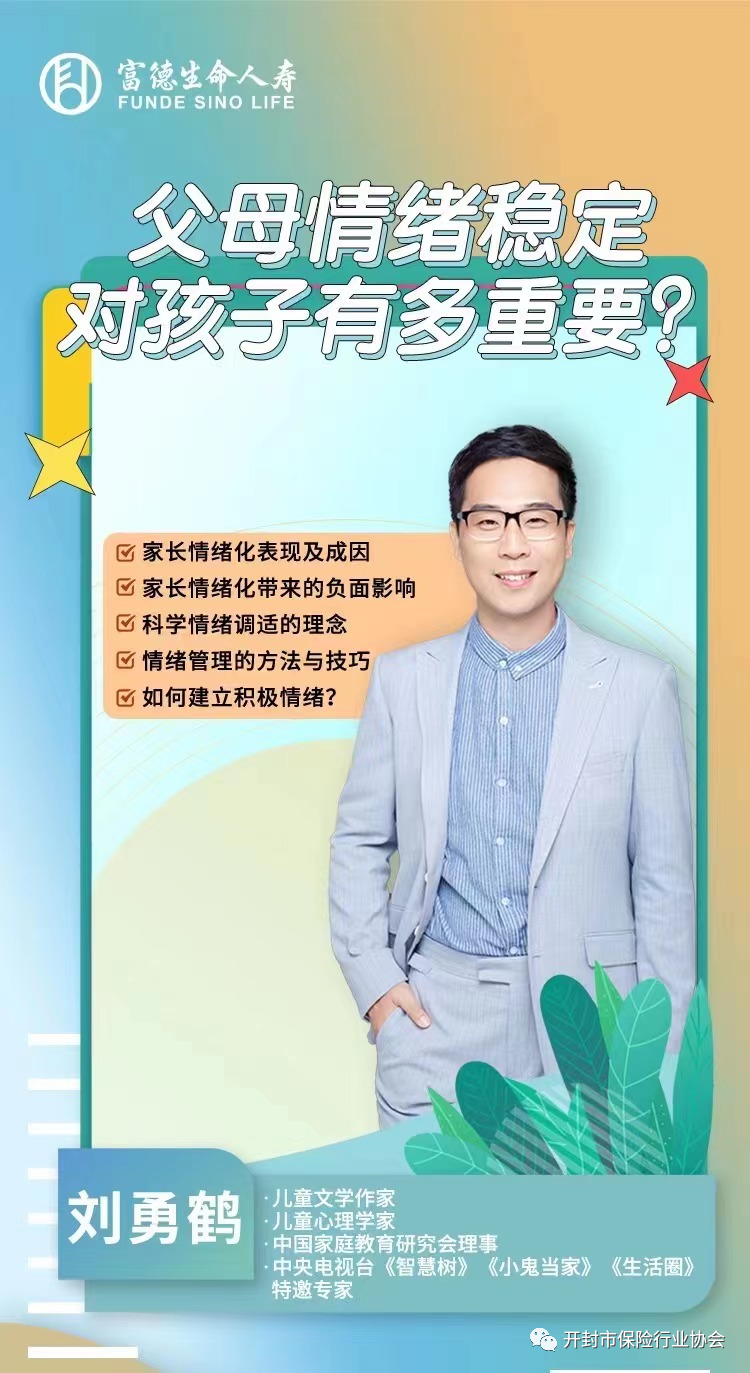 刘勇鹤本期讲座带来了父母情绪稳定,对孩子有多重要?俗话说三分情绪,七分表达,每个人每天都会有情绪的困扰,情绪的背后也会有产生的原因。父母的情绪会影响孩子的状态、信心,幸福和成功,通过列举情绪背后对孩子造成的心理影响,告诉大家如何科学的调整情绪,以及如何来建立积极情绪和智慧的生活方式。希望作为家长能够摒弃内疚式教育、指责式教育,拒绝冷暴力,要让孩子感受到温暖和爱,引导孩子完整表达情绪,独立思考,关注孩子身心健康,不做情绪化父母。