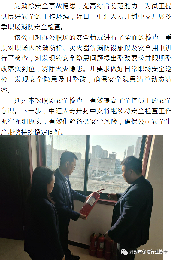 为消除安全事故隐患,提高综合防范能力,为员工提供良好安全的工作环境,近日,中汇人寿开封中支开展冬季职场消防安全检查。