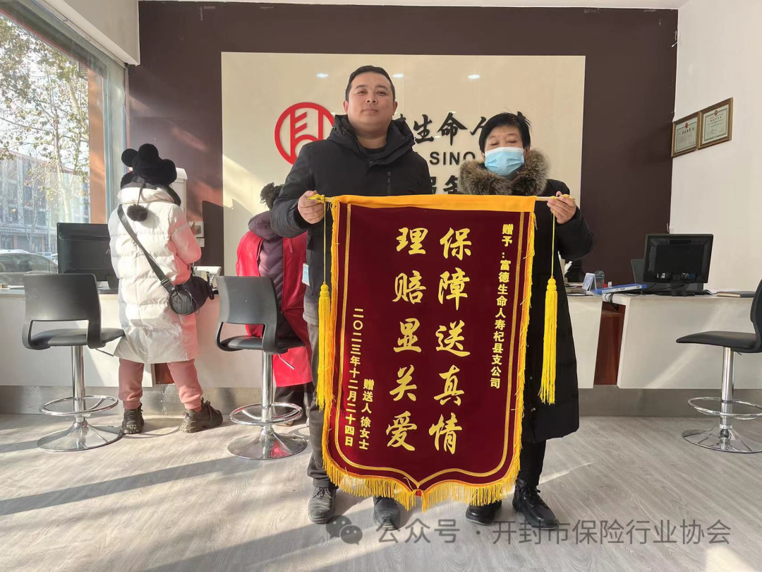 12月25日,徐女士为表达谢意,让其母亲携“理赔快速高效 服务热情周到”的锦旗至开封中支柜面,对富德生命人寿的理赔服务予以充分肯定。