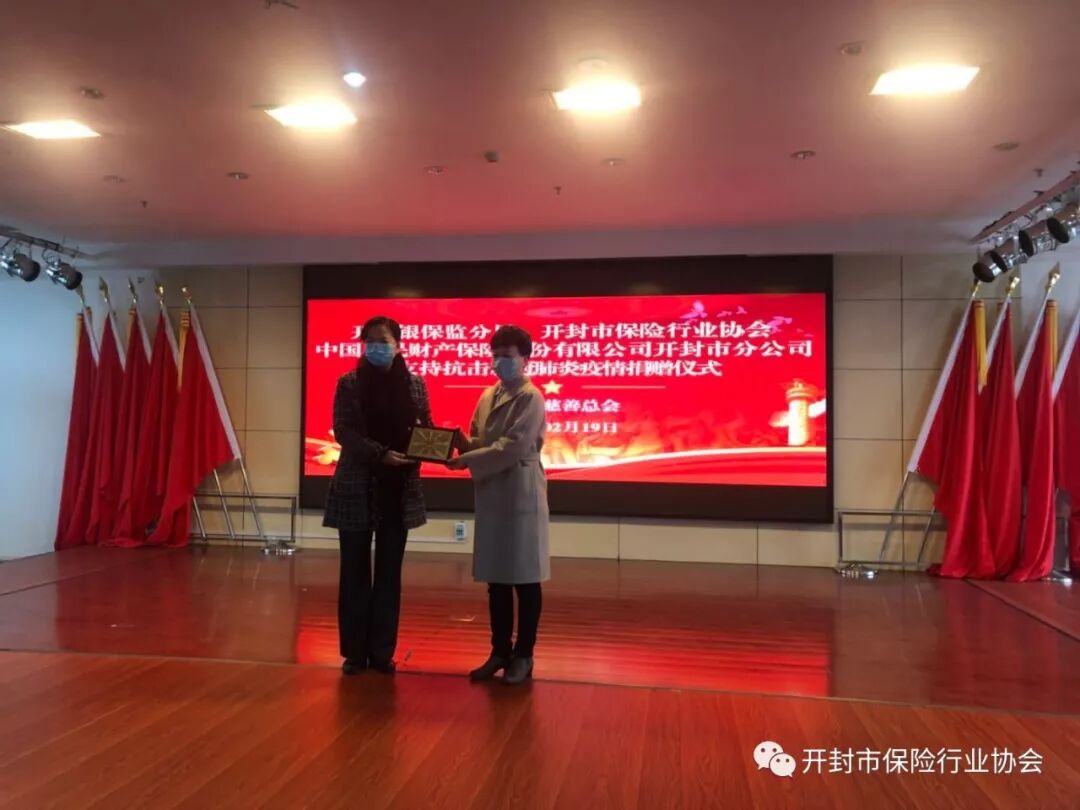 曹晓伟讲话在致辞中说,新冠肺炎疫情发生以来,全市上下坚决贯彻习近平总书记重要讲话重要指示批示精神,全面落实党中央决策部署和市委、市政府要求,同舟共济,众志成城,全力以赴抗击疫情,各项工作全面扎实有序推进。在市银保监分局领导和组织下,开封市保险行业积极捐款捐物、奉献爱心,我代表市委、市政府和全市人民向大家表示由衷的敬意和真诚的感谢。赛娟、张燕和于江向市慈善总会办公室主任张磊递交捐赠牌,市民政局党组书记、局长薛冬向赛娟、张燕和于江颁发捐赠纪念牌。张燕在讲话中说,在全市上下抗击新型肺炎疫情的关键时刻,开封市保险行业以实际行动支持疫情防控工作,向全社会彰显了保险行业价值和社会担当。一是开通绿色通道,积极做好理赔服务。二是积极行动,开展抗击病毒感染疫情募捐活动。全市保险系统员工已向开封市慈善总会捐赠爱心款44.8万元。三是发扬大爱精神,捐赠防疫物品和保险保障。向疫情防控一线工作人员送去口罩、酒精、84消毒液等防疫物资85.91万元,为疫情防控一线人员及社会公众赠送51.06亿余元的风险保障。在疫情危急关头,开封保险业的爱心奉献还将源源不断注入到当前的疫情防控中。我们将密切关注疫情进展,全力以赴、科学有效地做好疫情防控及医疗健康、保险保障服务等工作,争取在抗击疫情、保障经济安全运行及服务社会民生方面发挥更重要的作用。