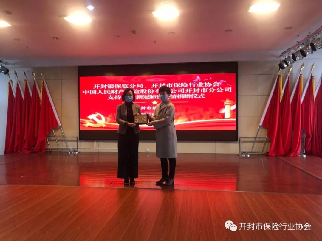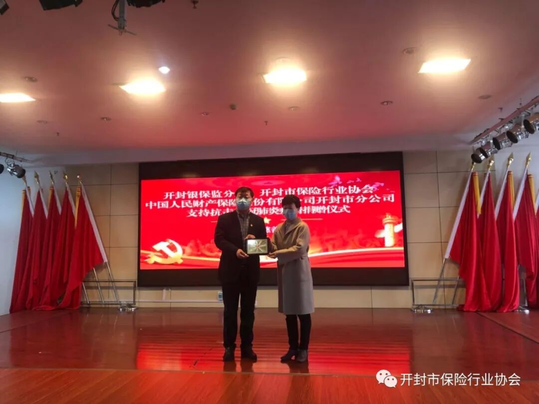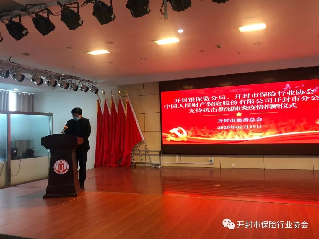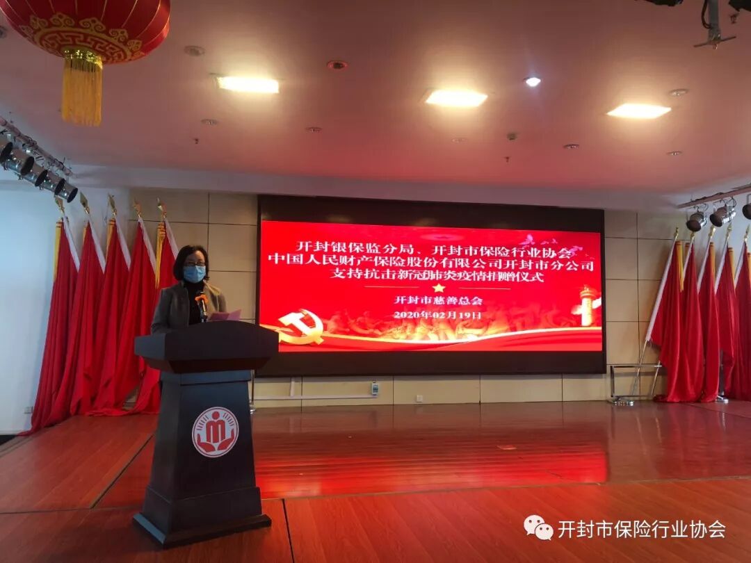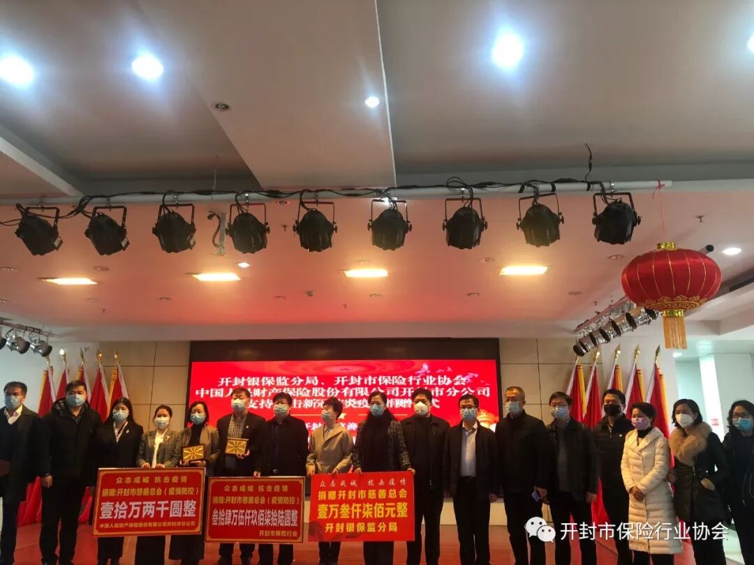 一方有难,八方支援。2月19日,开封银保监分局和开封市保险行业协会举行抗击新冠肺炎疫情捐赠仪式。市政府副秘书长曹晓伟、市民政局党组书记、局长薛冬、党组成员、副局长司啸汉、市银保监分局党委委员、副局长赛娟、市保险行业协会会长、人保财保开封分公司总经理于江、市保险行业协会秘书长张燕、市银保监分局普惠金融科副科长、团委副书记仝剑、市慈善总会办公室主任张磊和中国人寿、太平洋人寿、平安财险等八家保险机构负责人参加。