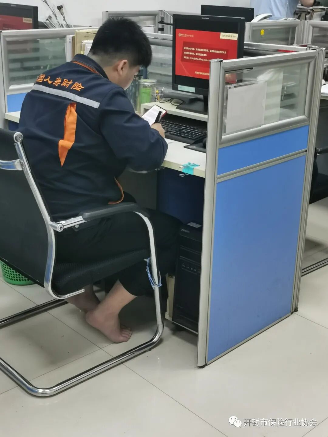 从理赔现场赶回到办公室后加班加点的保险一线人员