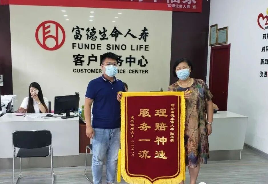 2020年8月12日上午7点,富德生命人寿杞县支公司业务主管张玉英代表客户白女士把一面写有“服务一流,理赔神速”的锦旗送到杞县支公司客服大厅理赔人员手中。