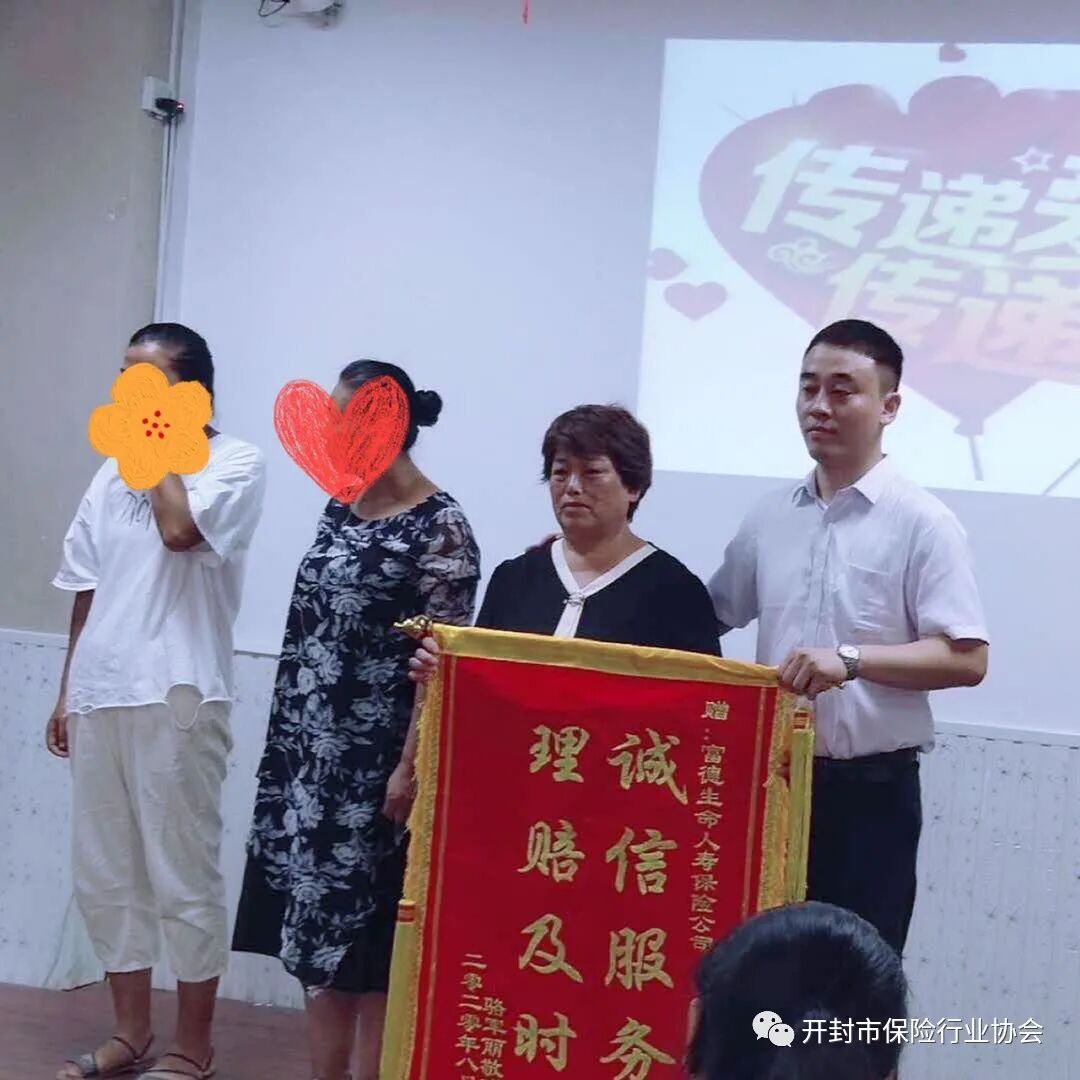 8月13日在富德生命人寿尉氏营销服务部的早会来了两位位特殊的老百姓,他们手捧一面写有“诚信服务、理赔及时”的锦旗,眼含热泪的把这面锦旗交到了工作人员手中,据了解,这是我司已故客户杨先生的母亲和妻子,当工作人员接过锦旗的一瞬间,杨先生的妻子再也控制不住自己的情绪,对工作人员深深的三鞠躬后说:孩子他爸不在了,家里的天塌了,是你们给了我活下去的勇气,是保险保住了我这个即将支离破碎的家。