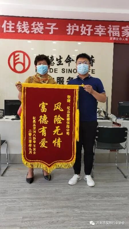富德有爱”的锦旗送到了杞县柜面,握住我司工作人员说:谢谢你们公司的大爱,我原来都不相信保险,现在我发现保险是真的太好了。