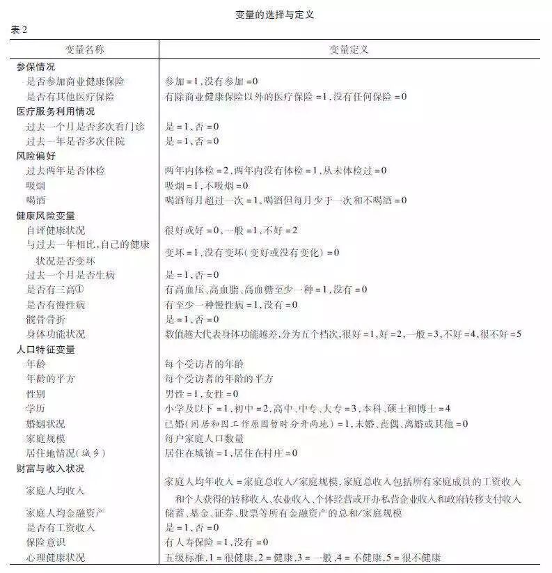 研究设计和数据描述 本文的研究主要解决两个问题,一是健康保险市场逆向选择的存在性检验,二是消费者异质性对健康保险市场逆向选择影响的检验,因此,本文针对上述问题构建了相关模型,并选择“中国健康与养老追踪调查(CHARLS)”2015年的数据作为本文的样本数据,具体研究设计如下: ◆ 实证模型设计 本文的实证包括两个方面,一是逆向选择的存在性检验,二是消费者异质性对逆向选择影响的检验,因此,本文构建两个不同的模型,以商业健康保险作为研究对象,分别检验这两个问题。 1.逆向选择的存在性检验模型 为证明消费者具有逆向选择行为,文章使用个人对自身健康风险的主观评价与保险保障程度的相关性检验。实证中,以“是否购买健康保险”作为被解释变量,个人主观评价作为解释变量,其他相关因素为控制变量,消费者任一主观风险评价指标与保险保障程度之间正相关则可说明逆向选择存在。 为验证逆向选择及其经济后果,文章首先使用客观风险程度与保险保障程度的相关性检验证明信息不对称存在,实证中通常使用“是否看门诊”与“是否住院”作为被解释变量,“是否购买健康保险”作为解释变量,两者之间存在显著的正相关关系则可证明信息不对称存在。然后再分离出道德风险的影响,则余下的信息不对称即为逆向选择。 对于商业健康保险,经济后果模型因受社会医疗保险高普及度的影响,实证文献中通常所使用的“是否看门诊”和“是否住院”已不能区分“是否有商业健康保险”群体之间的风险差异,信息不对称的检验受到干扰,同时这种检验的结果是来源于逆向选择还是道德风险不得而知。为解决该模型的这两大缺陷,本文从医疗服务利用频次入手,提出了应当使用“是否多次看门诊”和“是否多次住院”来区分两个群体之间的风险差异,以此来检验商业健康保险中的信息不对称。 为讨论多次医疗服务利用中是否存在道德风险,文章基于效用理论,认为消费者患病会导致物质财富损失、健康损失,以及产生非医疗费用成本,因此道德风险随着医疗服务利用次数的增加而减少,直至逐渐消失,余下的信息不对称即为逆向选择。同时通过严格的数学论证还发现,影响道德风险变化的因素是健康效用损失和非医疗费用成本,而与保额和保险形式无关,也就是说,无论购买何种保险(商业健康保险还是社会医疗保险,或是其他具有相同作用的保险形式)以及是否购买多种保险,健康效用损失和非医疗费用成本的增加对道德风险的抑制效果相同。 综上所述,结合我国社会医疗保险广覆盖、商业健康保险作为补充的现实特点,从理论上来看,我国商业健康保险和社会医疗保险的信息不对称情况应如图1所示。 实证时,如果有至少任意一种健康保险的群体多次医疗服务利用中不存在信息不对称,则说明逆向选择和道德风险均不存在。由于社会医疗保险覆盖广,2015年覆盖率已达到95%以上,因此有至少一种健康保险的群体风险特征与整体人口几乎一致,故不存在逆向选择,可见以社会医疗保险为主的有保险群体,随着医疗服务利用次数的增加,信息不对称逐渐消失是由道德风险逐渐减少所导致。如果该结论成立,则在商业健康保险中同样适用。 2.消费者异质性对逆向选择影响的检验设计 在验证逆向选择存在的基础上,使用逆向选择的经济模型进一步实证分析消费者异质性对逆向选择程度的影响,为简化证明,使用住院利用作为被解释变量进行分析,不考虑门诊利用情况。其实证思路为,根据待分析变量对数据样本进行拆分,对形成的子样本分别进行逆向选择检验,获取医疗服务利用与购买商业健康保险之间的相关性,并对各子样本的检验结果进行比较,以此来解释消费者异质性对逆向选择程度的影响。例如,将消费者按照年龄分为年轻群体和年老群体,检验两个群体中的选择效应,以说明年龄异质性对逆向选择程度的影响。 ◆ 数据来源 本文使用北京大学国家发展研究院主持的“中国健康与养老追踪调查(CHARLS)”2015年数据。CHARLS全面涵盖了逆向选择实证研究中所需要的相关变量,包括消费者参保情况、医疗服务利用情况、风险偏好、财富水平、人口特征、保险意识和心理健康状况等多方面的变量,符合研究需要。同时,由于市场处于动态变化中,该调查数据更新至2015版,时效性更好、更贴近当前市场的客观情况。实证研究中,删除缺失所需变量的样本后,剩余共计14900个有效样本。 ◆ 变量的选择与描述 前文已经说明,在商业健康保险逆向选择的研究中,应当使用“是否多次看门诊”、“是否多次住院”,才能更有效地区分消费者的风险程度,使用是否购买健康保险作为解释变量代表保障程度,以此来考察风险程度与保险保障程度之间的相关性。实证中医疗服务利用次数从两次开始逐步检验,直至找出与购买健康保险正相关的门诊次数和住院次数。所有变量的选择与定义如表2所示。 实证检验结果分析 ◆ 逆向选择存在性检验结果分析