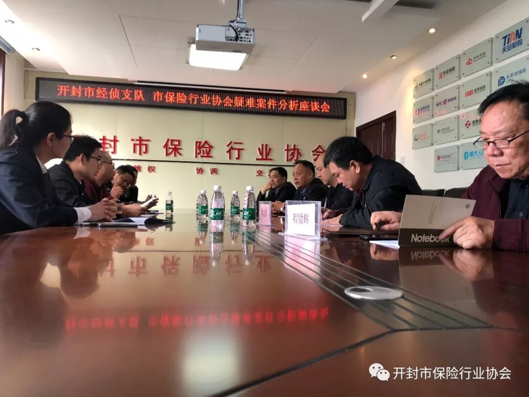 10月11日,开封市保险行业协会联合开封市经侦支队召开疑难案件分析座谈会。开封市公安局经侦支队队长陈军、副队长张宏及部分寿险公司理赔工作人员参加会议。开封市保险行业协会监事刘克田主持。