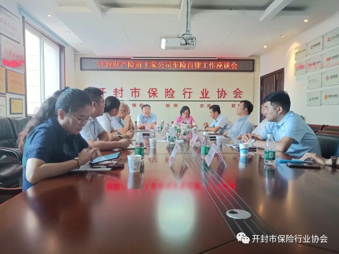 8月18日下午,开封保协组织财险前十家公司负责人召开车险自律工作座谈会,协会会长于江、秘书长张燕、驻会监事刘克田及前十家公司总经理或代表参加会议。