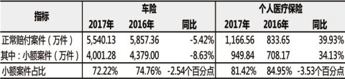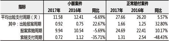 赔案总量变化情况 2017年,车险正常结案(2)理赔案件5540.13万件,同比下降5.42%,其中车险小额正常结案理赔案件(以下简称“车险小额案件”)4001.28万件,同比下降8.63%;车险小额案件在正常结案案件中占比72.22%,同比减少2.54个百分点。个人医疗保险正常结案理赔案件1166.56万件,同比上升39.93%,其中个人医疗保险小额正常结案理赔案件(以下简称“个人医疗保险小额案件”) 理赔案件变化情况 各项指标监测结果 01 理赔周期 2017年,车险小额案件平均出险支付周期为11.58天,同比缩短6.69%。其中,索赔支付周期为0.72天,同比缩短35.71%。 车险理赔周期 2017年车险小额案件理赔周期 2017年,个人医疗保险小额案件平均出险支付周期为60.27天,同比缩短12.38%。其中,索赔支付周期为1.31天,同比缩短25.22%。 个人医疗保险理赔周期