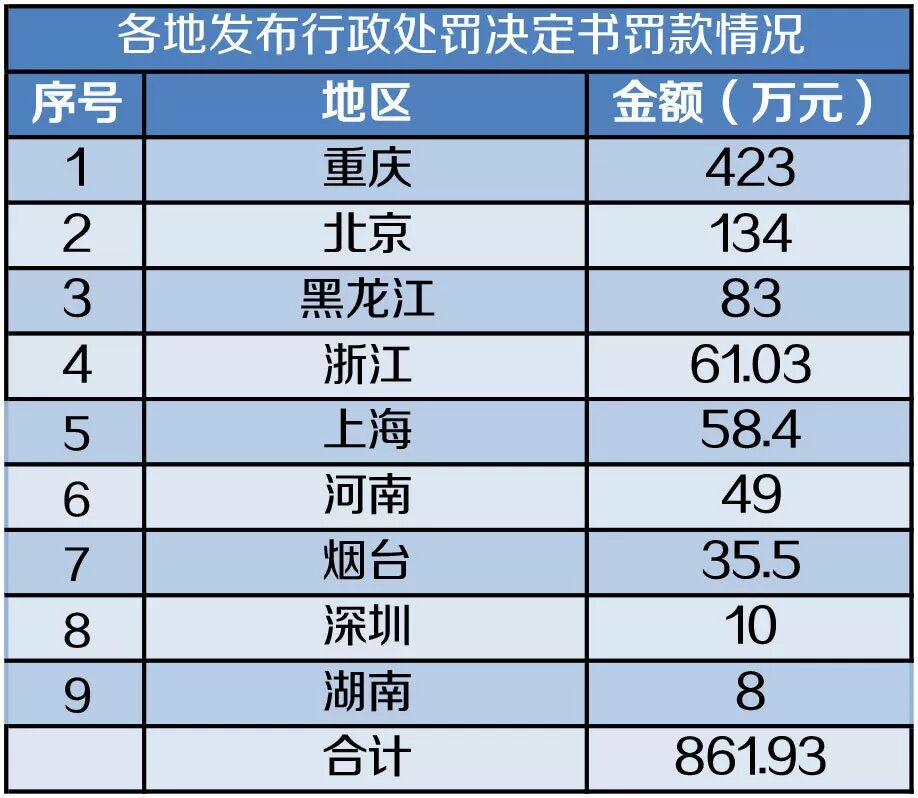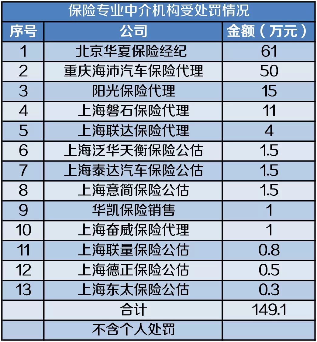 5月17日,中国银保监会网站公布了对华海财险和永诚财险两家公司的行政处罚决定书。华海财险因存在聘任不具有任职资格人员担任公司董事的行为,被罚款3万元,2名责任人被分别罚款3万元、1万元。永诚财险因存在委托未取得合法资格的机构从事保险销售活动的行为,被罚款30万元,2名责任人被分别罚款10万元。 5月份,全国9个地方监管部门对相关保险机构进行了处罚。 从行政处罚决定书的发布数量来看,上海、重庆和河南以21张、9张和8张排名前三。 从罚款金额来看,重庆、北京和黑龙江以423万元、134万元和83万元位列前三。 5月份,监管部门对14家保险公司进行了处罚。太保产险、人保财险和阳光农险三家公司以153.5万元、78万元和50万元的处罚金额排在前三位。 在被处罚的14家保险公司中,12家为财产险公司,人身险公司仅有2家。 其中,最大的一笔罚单由重庆银保监局开出,太保产险重庆分公司因存在给予投保人保险合同约定以外的其他利益、编制虚假财务资料的违法行为,合计被罚款80万元。 这些公司被处罚的主要原因主要有:编制虚假资料,拒绝妨碍监督检查、欺骗投保人,在监管部门责令停止接受新业务期间办理新业务,聘任不具有任职资格人员担任公司董事,委托未取得合法资格的机构从事保险销售活动,给予投保人保险合同约定以外的其他利益等。 阳光农险3家支公司被黑龙江银保监局给予停业处罚:1家支公司被停止接受种植险新业务3年,另外2家支公司被停止接受种植险新业务1年,3家公司高管均被撤销任职资格。 具体来看,阳光农业相互保险公司甘南支公司因在监管部门责令停止接受种植险新业务期间办理新业务,被停止接受种植险新业务3年,主要负责人刘晓勇被撤销任职资格。阳光农业相互保险公司依安支公司因编制虚假现场查勘记录,被停止接受种植险新业务1年,主要负责人刘沛岩被撤销任职资格。阳光农业相互保险公司梅里斯营销服务部因虚假理赔,被停止接受种植险新业务1年,主要负责人富全冬被撤销任职资格。 此外,中国人寿北京昌平支公司因拒绝妨碍监督检查、欺骗投保人,被北京银保监局罚款30万元,责令停止接受新业务一年。主要负责人郭瑞森被罚款10万元,撤销任职资格。 5月份以来,各地银保监局强化了对保险中介机构的监管力度,对13家保险中介机构进行了处罚。在上海银保监局发布的21张罚单中,有19张是针对保险中介的违规行为。 被处罚的原因包括:编制或者提供虚假的报告、报表、文件、资料,未按规定投保职业责任保险,聘任不具有任职资格的高管人员,利用业务便利为其他机构或者个人牟取不正当利益,未妥善保管业务档案、会计账簿、业务台账以及佣金收入的原始凭证等有关资料等。 在互联网平台方面,杭州心有灵犀互联网金融股份有限公司未取得经营保险经纪业务许可证从事保险经纪业务,被浙江银保监局没收违法所得61.03万元,并处罚款61.03万元。 今年以来,银保监会加强了保险中介业务监管。2月发布《关于加强保险公司中介渠道业务管理的通知》,明确五大内控要求、九大严格把关要求和9个“不得”要求。4月发布《2019年保险中介市场乱象整治工作方案的通知》,禁止第三方网络平台非法从事保险中介业务。 业内人士表示,在强监管下,保险中介市场或面临新一轮的洗牌。 统计数据来自银保监会网站,如有出入请以官方数据为准。